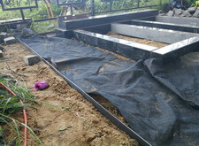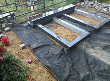 Устанавливаем общее основание для памятников, выставляем два одинаковых цветника. Площадь, которую планируется выложить брусчаткой, укрываем геотекстилем.
