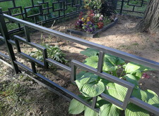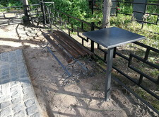 Дополнительно устанавливаем напротив надгробий металлические лавочку и столик, сидение скамьи изготовлено из дерева.