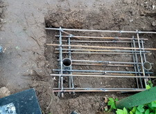 Далее мы приступили к изготовлению надёжного каркаса для массивной гранитной плиты. Взяв привезённые заранее сваи, мы вырыли относительно глубокую яму, и забили металлические трубы с двух сторон по её краям. Они и послужат двумя главными опорными точками для металлического каркаса, который мы тут же сварили из арматуры.